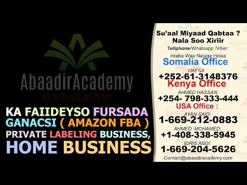 Amazon FBA business Waa Ganasi Aad Ka sameyn karto Lacag badan adigoo aadan Marin howl Aad u badan .. Baro sida Amazon FBA u shaqeeyso, baro si Manufacturing Ka China loola shaqeeyo , Waa fursad u Qof waliba Oo Somali ah Ka faiideysan karo. Fadlan haddii Aad u bahan tahay warbixin dheeread ah booqo http://ift.tt/2g2OJ3B or call me at (408)826-7614